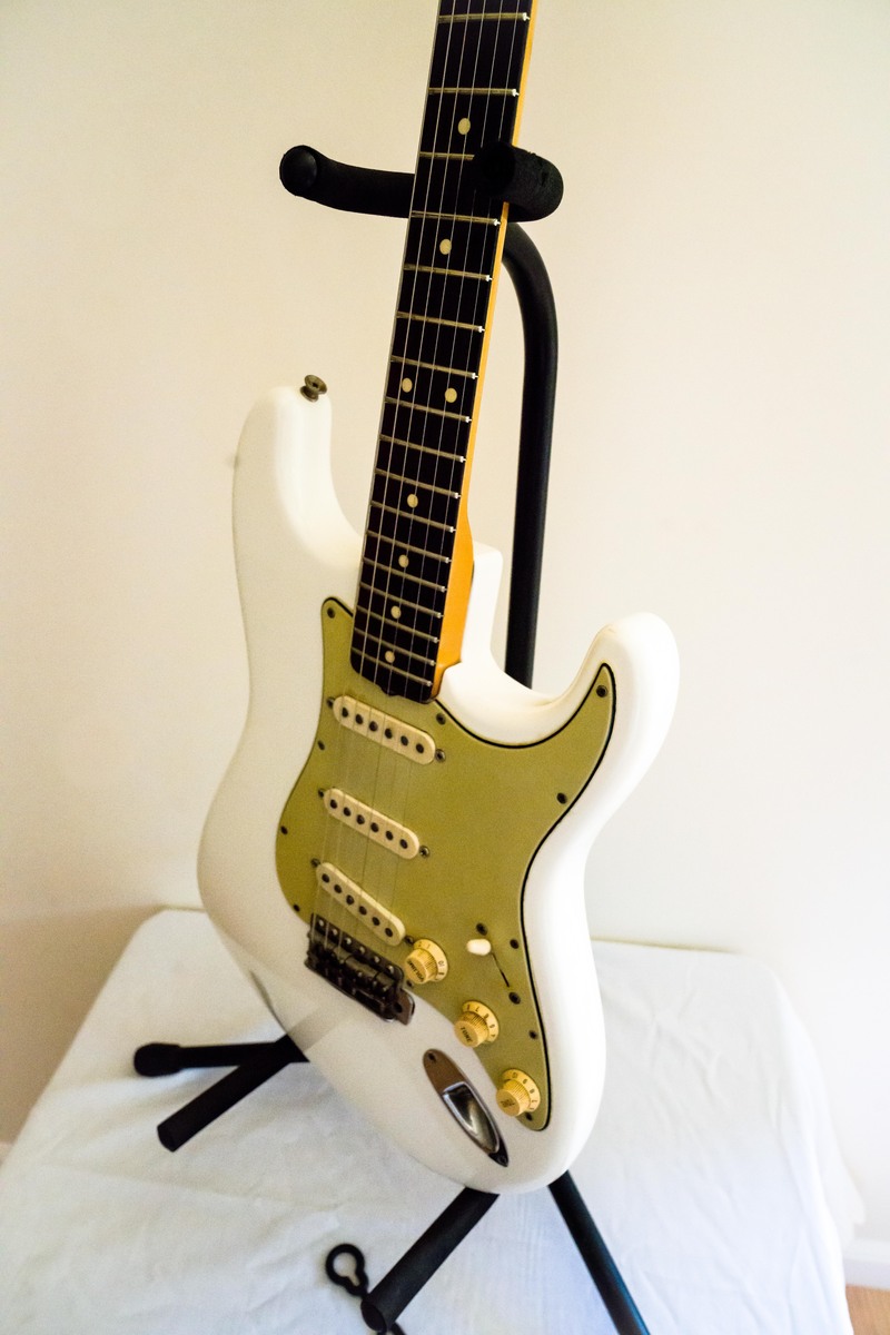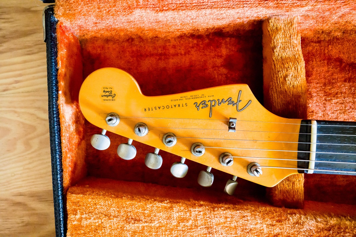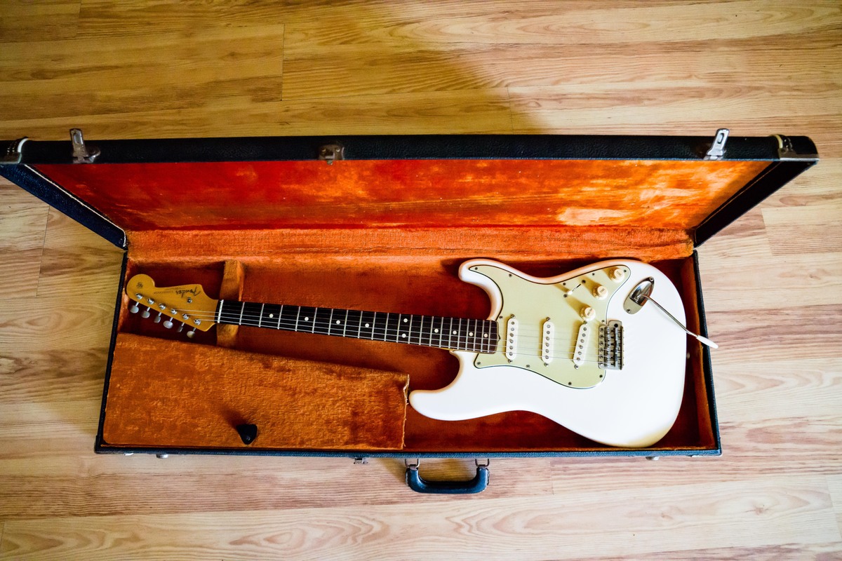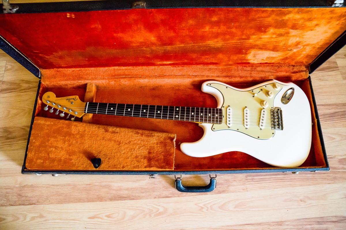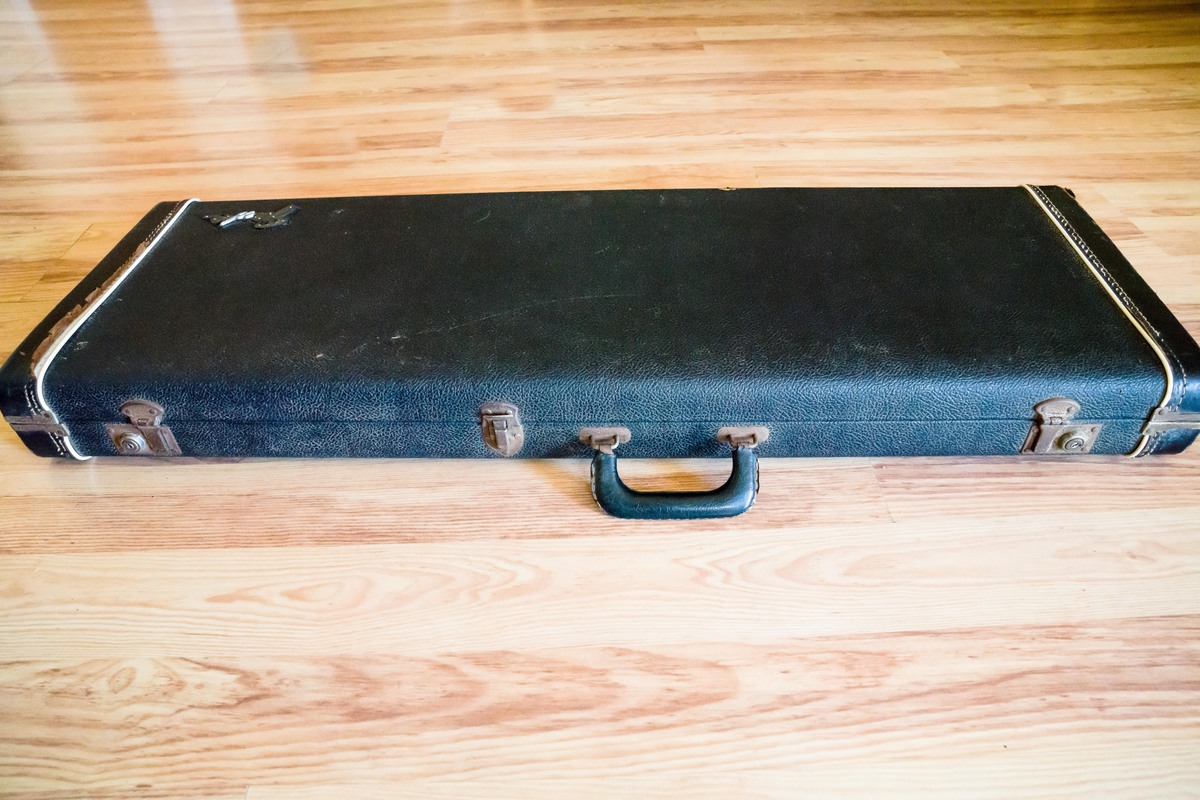 Case exterior has minor wear with paint partially worn off of logo, case interior clean and intact. No dings on body. Switch and knobs all clean and functional. Intonation good and plays cleanly on all frets. Tuners clean and functional.