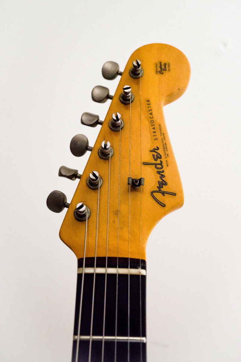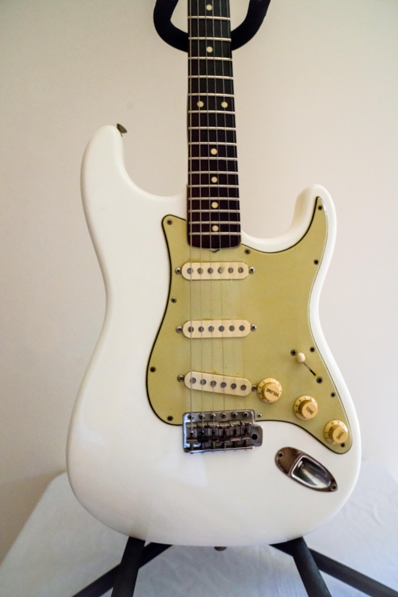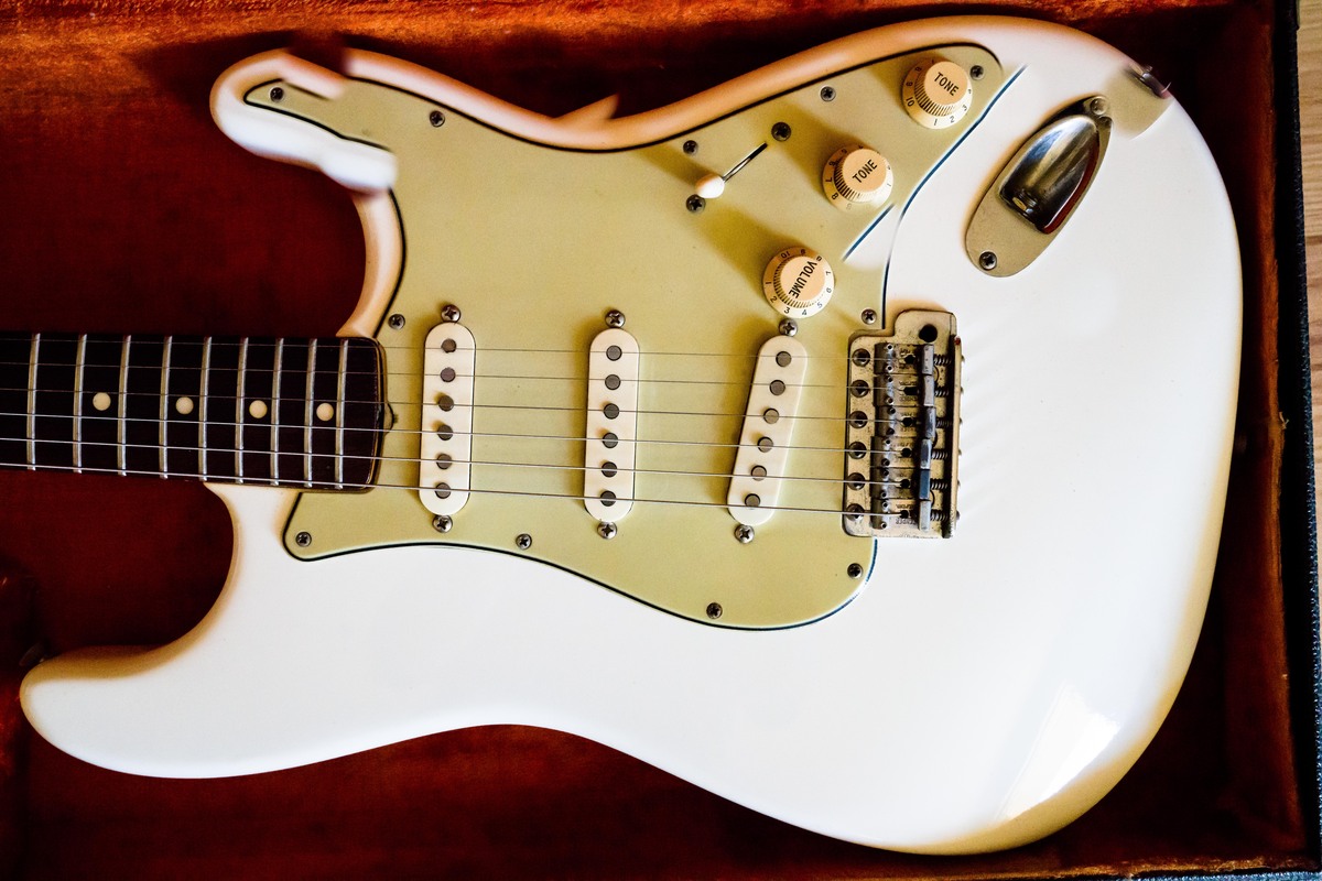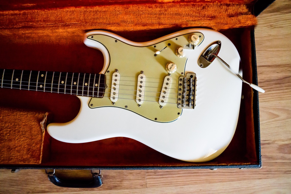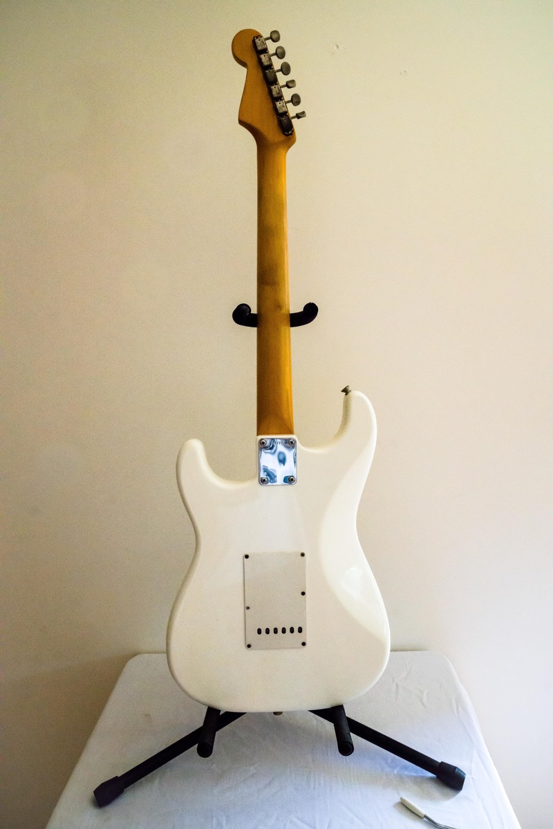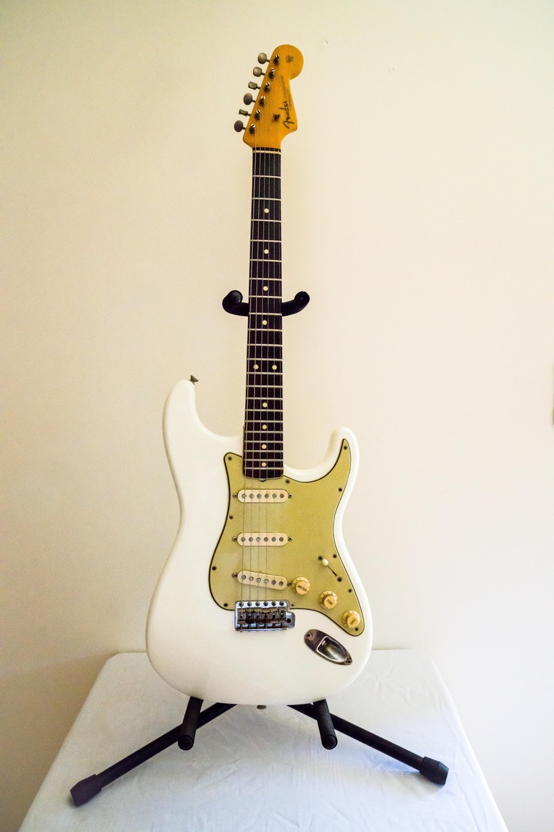 Case exterior has minor wear with paint partially worn off of logo, case interior clean and intact. No dings on body. Switch and knobs all clean and functional. Intonation good and plays cleanly on all frets. Tuners clean and functional.