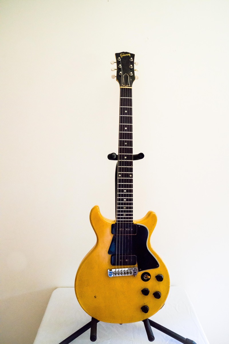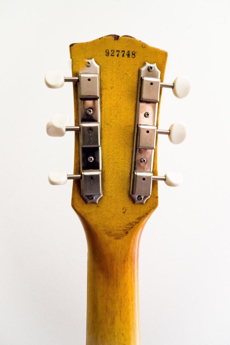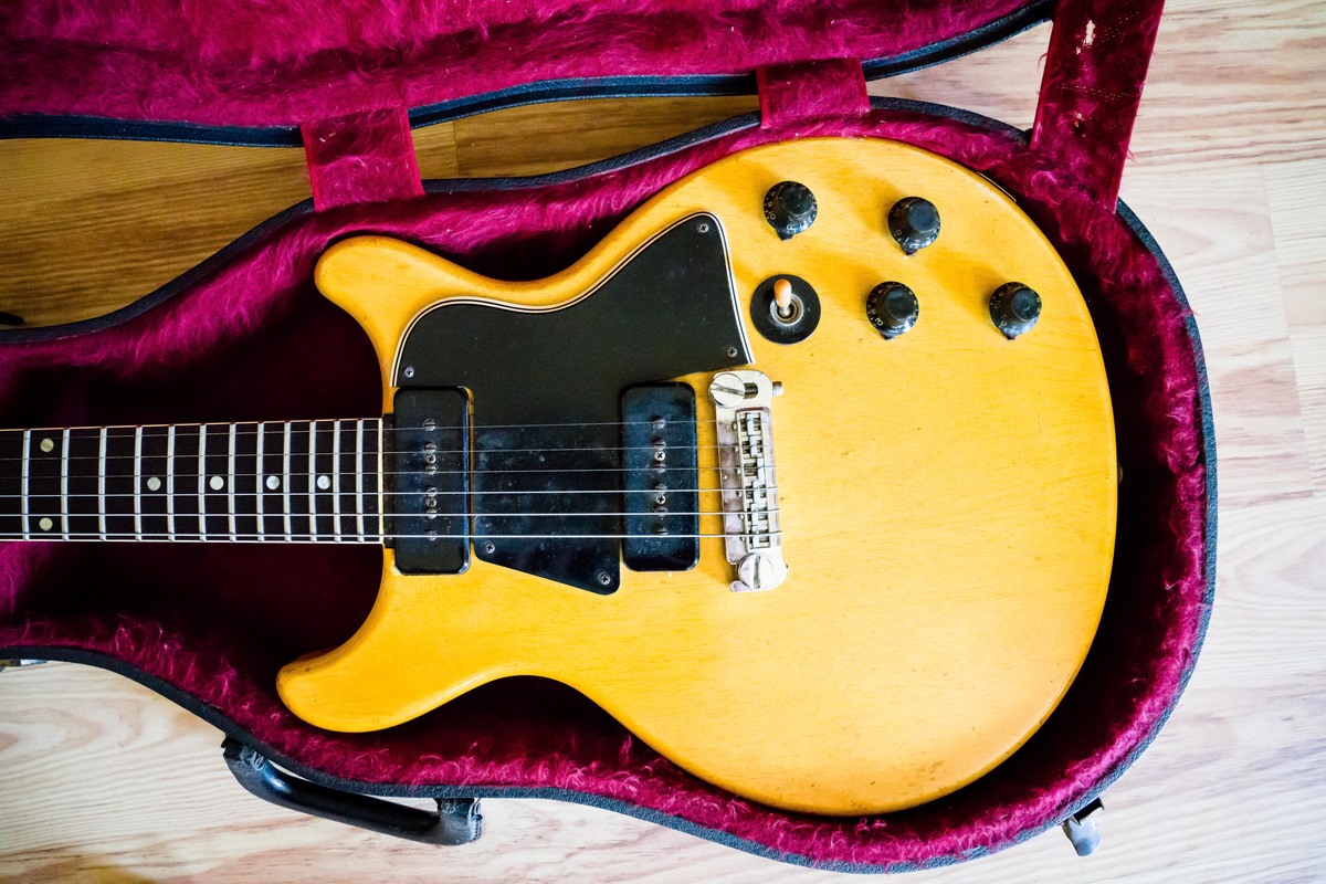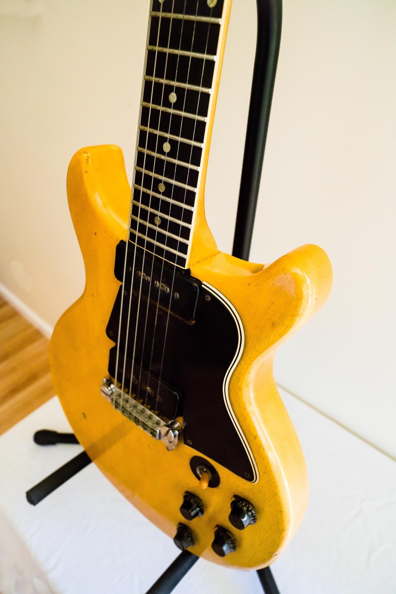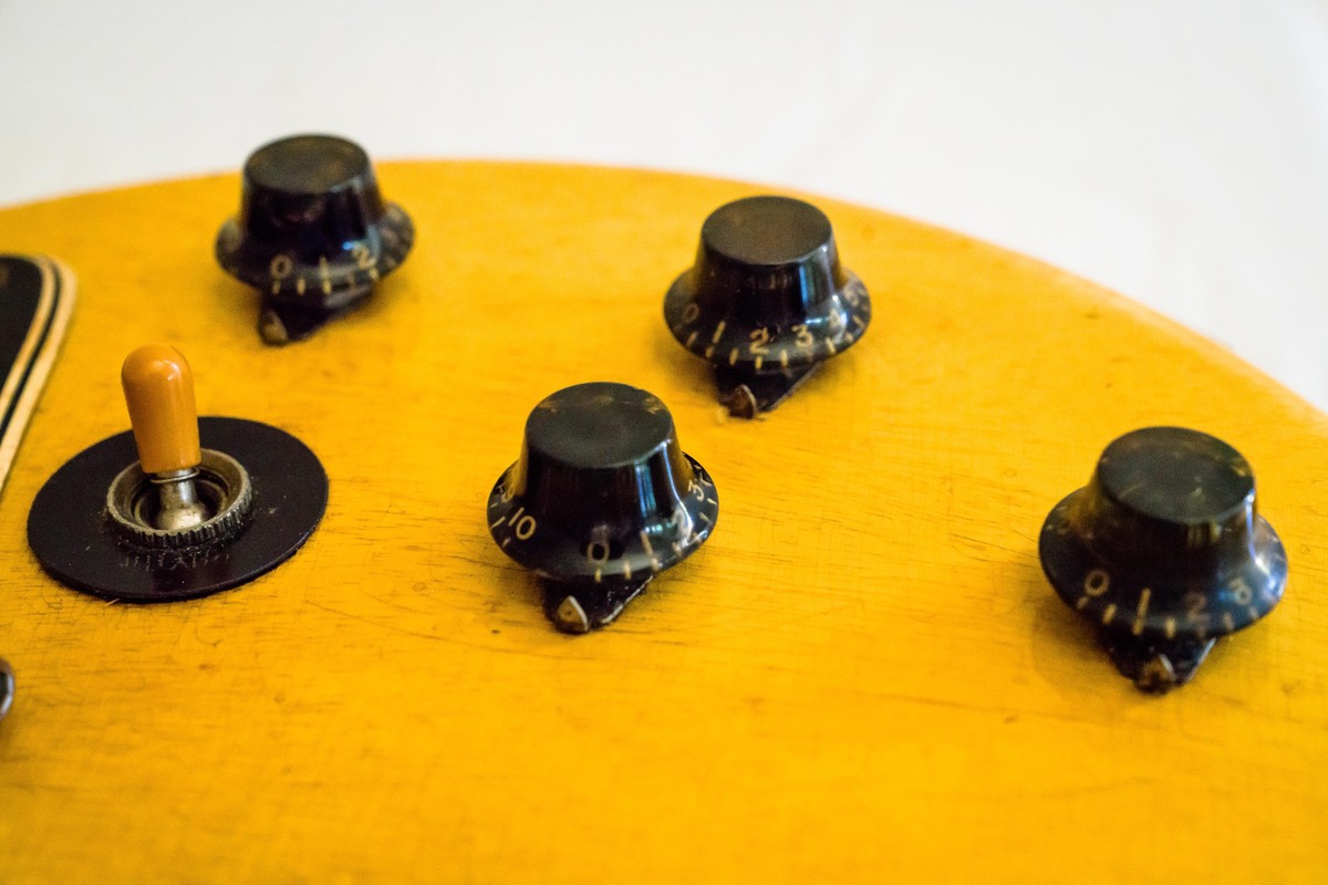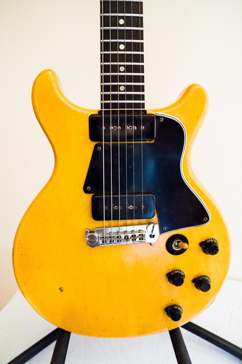 Case exterior has obvious wear, case interior clean and intact. Several minor dings on front and back. Intonation good and plays cleanly on all frets. Switch and knobs all clean and functional. Tuners clean and functional.